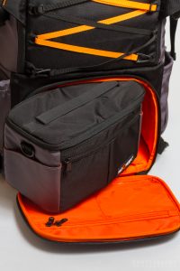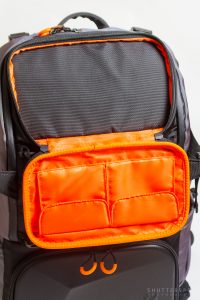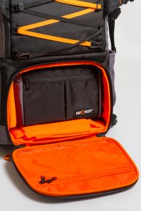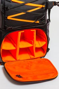 The upper zip opens onto the main quick access camera area. The compartment comes composed with the standard velcro separators that can be positioned to suit your own camera body and lens selection. It can comfortably hold a body and attached lens, with storage for 4-5 other lens or accessories. At the front, the compartment is covered by a thin zip down partition which has a small net area that can hold other peripherals, cards, etc. On the inside of the flap there is a deep, padded zip pocket which is perfect for holding 2-3 lens filters if you happen to have them in slimline cases.