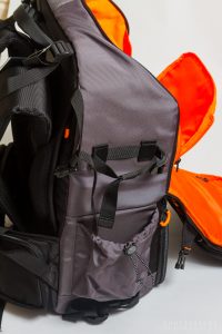 On each side of the bag there is a pocket which can hold tripods, water bottles, etc. Rather than clips for holding the tripods, an expandable strap is supplied so you have to drop the tripod into the loop, into the pocket, and then tighten the strap. For larger tripods, there is a secret pull out extra pocket on the corner/bottom of the bag. (So secret, I didn’t actually discover this till later and had been seating my tripod in the main pocket)