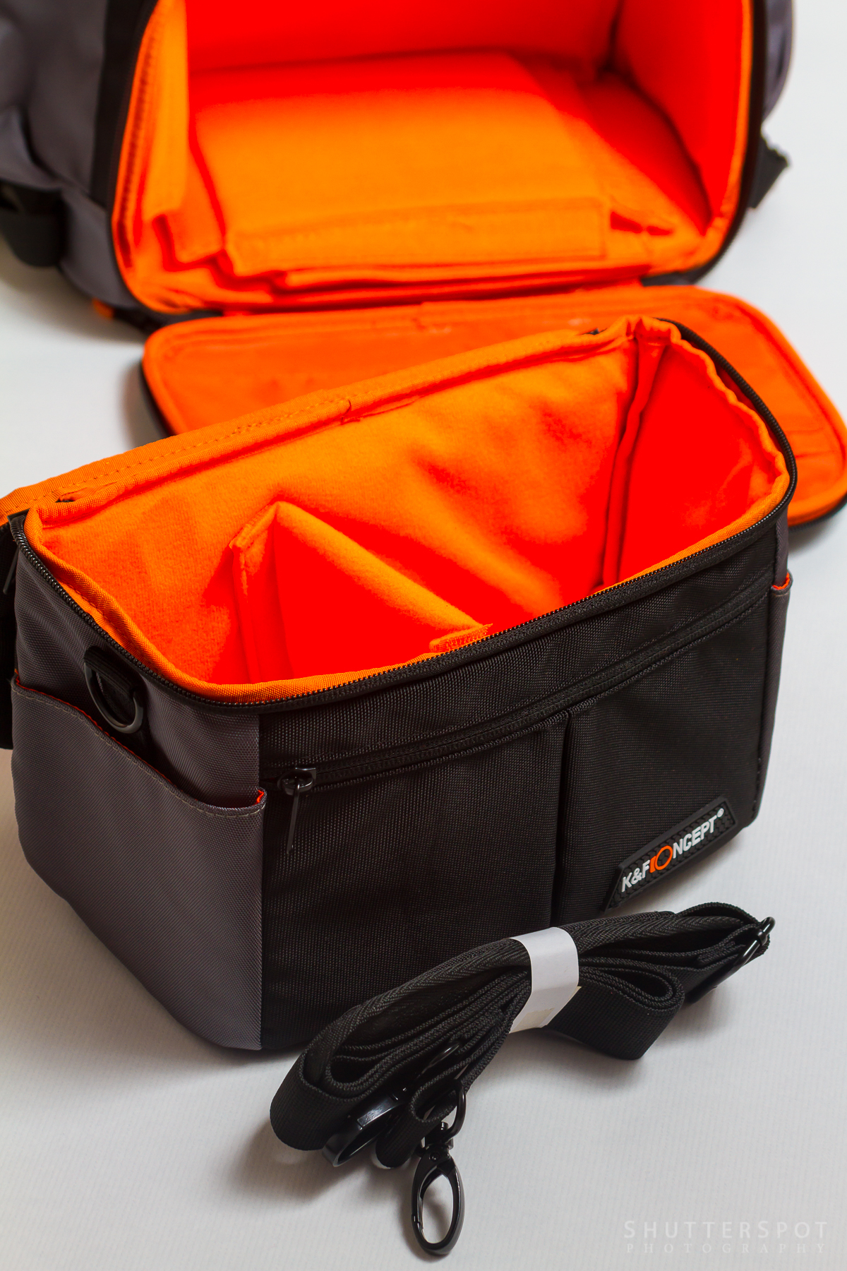 The backpack comes supplied with a bonus second, small shoulder camera pack. The bag can be worn with the supplied shoulder strap or can be attached to the waist. The bag itself is large enough to hold a DSLR and lens, and possibly a second lens depending on the size of the camera body. The bag is supplied with an extra padded velcro compartment separator but you could also use some of the separators supplied with the main bag if you so choose.