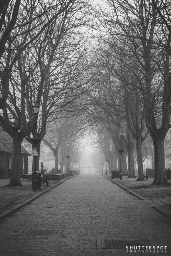 Keywords: avenue, black and white, fog, mist, park, path, trees