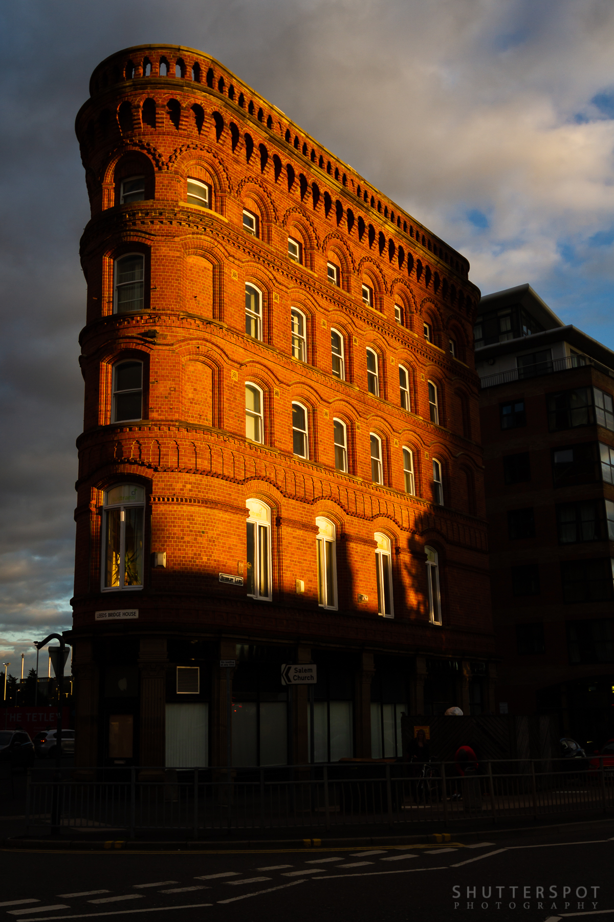 Keywords: architecture, bridge house, flat iron, leeds, sunset, yorkshire