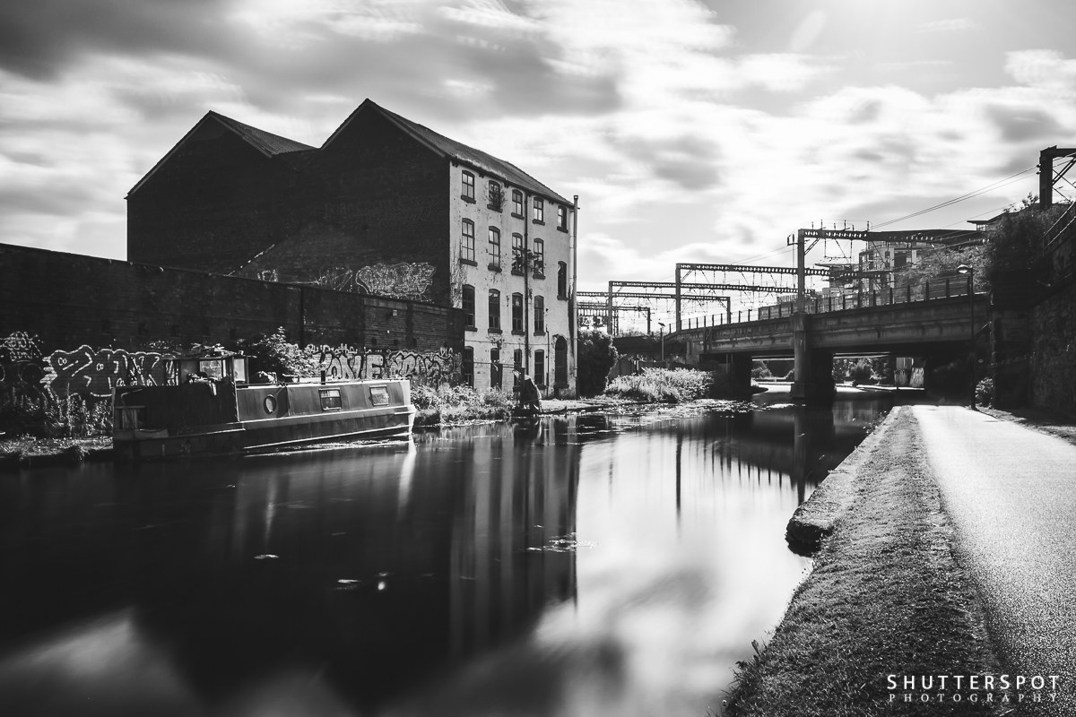 Keywords: black and white, canal, canalboat, contrast, industry, leeds, long exposure, mills, modern, reflection, waterway, yorkshire