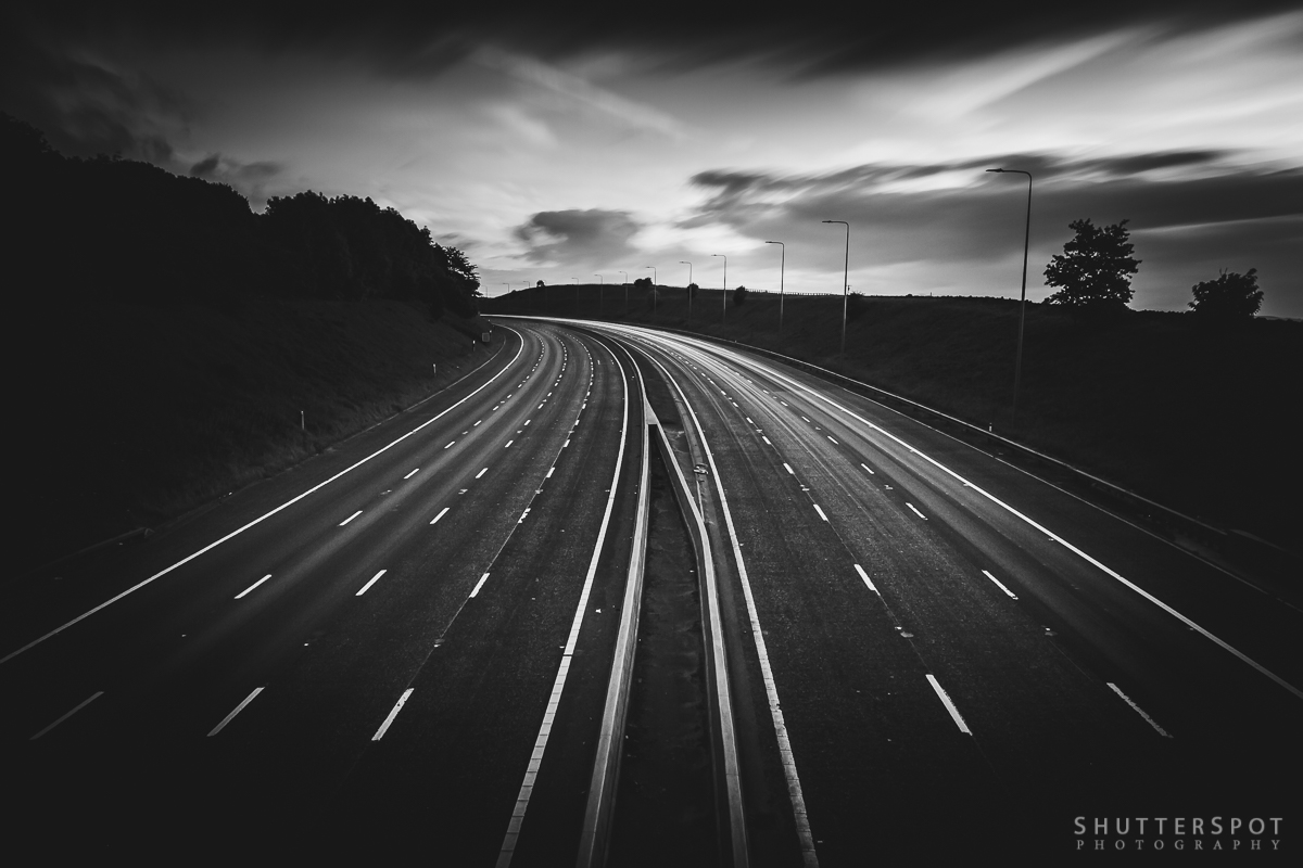Keywords: black and white, long exposure, m62, monochrome, motorway, road, yorkshire