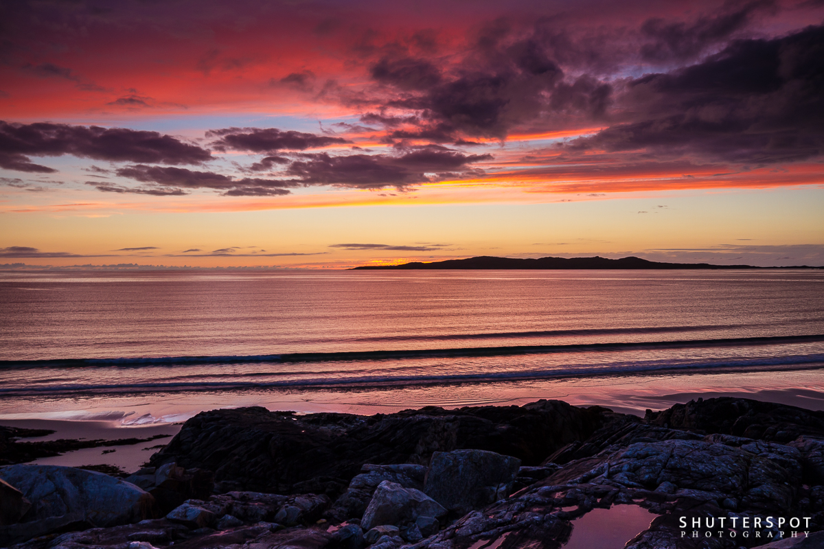 Keywords: Horgabost, Isle of Harris, Taransay, Traigh lar, beach, colours, reflection, rocks, scotland, sky, sunset, waves